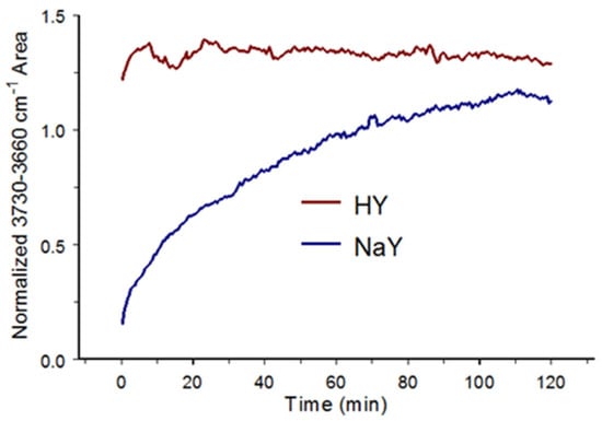 Figure 12 shows plots of HY (red) and NaY (blue) 3730–3660 cm−1 integrated areas-versus-time derived from spectra obtained at 10 °C. HY areas initially exceeded the fully hydrated spectrum area by about 25% and then exhibited a slight negative slope. The area decrease can be attributed to a loss of isolated SiOH and AlOH functional group vibration band intensities due to the red shifting of these bands by hydrogen bonding. The blue curve in Figure 12 indicates that the NaY 3700 cm−1 band area increased dramatically with time. The area exceeded the fully hydrated spectrum area after 60 min and continued to increase until 100 min was reached. Between 100 and 120 min, the area decreased slightly.