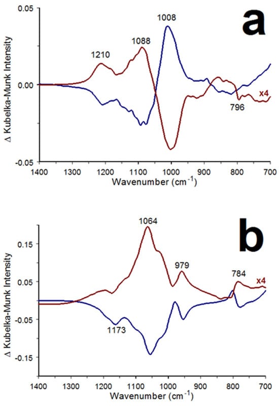 Figure 13 compares HY and NaY difference spectrum patterns for overlapping framework vibration band variations detected during the 2 h 10 °C isothermal measurements (blue) and in the 75 °C irreversible difference spectra (red). The plots in Figure 13a for HY are nearly mirror images, suggesting that the 75 °C irreversible difference spectrum in Figure 7 represents the impact of water loss on framework vibrations. The curves in Figure 13b mirror each other below 1100 cm−1. However, the 1173 cm−1 negative band in the 10 °C isothermal spectrum subtraction result is also negative in the 75 °C irreversible difference spectrum. Thus, the 1173 cm−1 intensity changes were not correlated with water loss/gain. The band shapes and peak locations in the HY and NaY difference spectra differed substantially, suggesting different mechanisms. Apparently, temperature-dependent Na+ interactions resulted in band intensity changes, whereas HY differences included both intensity and wavenumber variations.