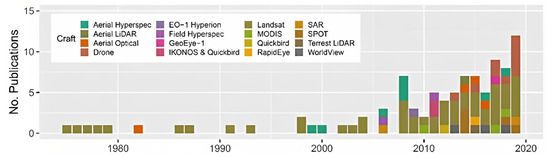 UAVs are being used more frequently nowadays because of advancements in sensor and control technologies. They can use a range of single-band, multispectral, and hyperspectral sensors, including those that function in visible, infrared, and microwave spectrums [15]. Their application in heritage and archaeological site mapping [16], transportation [17], civil engineering [18], agriculture [19], landscape mapping [20], wildlife conservation [21], infrastructure inspection [22], and search and rescue [23] have been investigated in several studies. According to McKenna, et al. [5], who conducted a study on the use of remote sensing in mine rehabilitation over more than 50 years, drones have become increasingly popular in recent years. The study found that although 50% of the studies used data from Landsat sensors throughout the 50-year period, other types of sensors became more prevalent over time, particularly between 2010 and 2019. In fact, during the years 2017–2019, drones were used in 25% of the studies, while aerial hyperspectral, aerial optical, high-resolution earth observation Satellite Pour l’Observation de la Terre (SPOT), and WorldView were used in 8%, 4%, 5%, and 3% of the studies, respectively. Figure 1 shows a notable rise in the incorporation of drones in research studies over the last ten years.