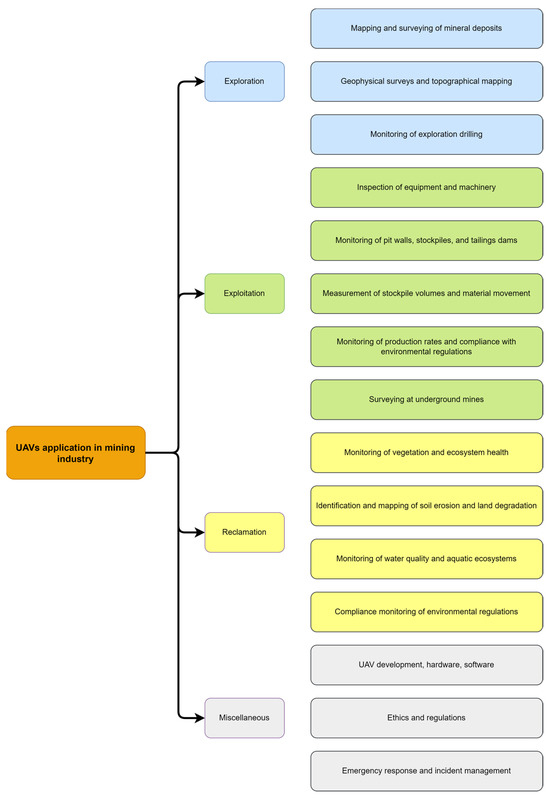 UAVs are used in mining to map sites, inspect the equipment, and gather data [28]. This information is useful in planning mining operations and monitoring environmental impacts. UAVs enable the faster and more efficient maintenance and repair of equipment [29,30,31]. Studies also aim to quantify mineral resources and characterise geomorphic properties [32,33]. Therefore, as seen in Figure 2, the applications of UAVs in the mining industry can be categorised into four groups: Exploration, Exploitation, Reclamation, and Miscellaneous. Figure 2 illustrates the present and possible uses in each category.