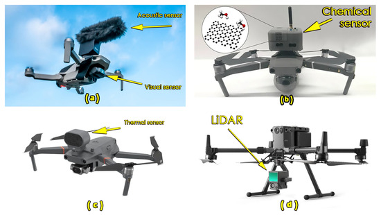 Figure 4. Different UAV sensors: (a) Acoustic sensor, visual sensors, (b) chemical sensor, (c) thermal sensor, and (d) LiDAR sensor.