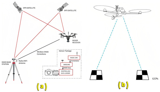 Typically, UAV imagery uses two georeferencing techniques: direct and indirect [48]. Inertial Measurement Units (IMUs) and Global Navigation Satellite Systems (GNSS) are used to locate the camera’s viewpoint centre and approximate its orientation parameters during acquisition using direct georeferencing. Direct georeferencing is impacted by the quality and accuracy of onboard GNSS and IMU (Figure 8a). Indirect georeferencing, on the other hand, uses Ground Control Points (GCP) or locations with well-known coordinates in the scene. UAV imagery typically displays a chessboard target surrounded by a GNSS-based static post-processing technique for identifying GCPs [49]. Indirect georeferencing requires more time and effort than direct georeferencing. Furthermore, the accuracy of indirect georeferencing depends on the technician’s ability to locate the references in the imagery, the correct measurement of GCP positions, and the number of GCPs used (Figure 8b) [50].