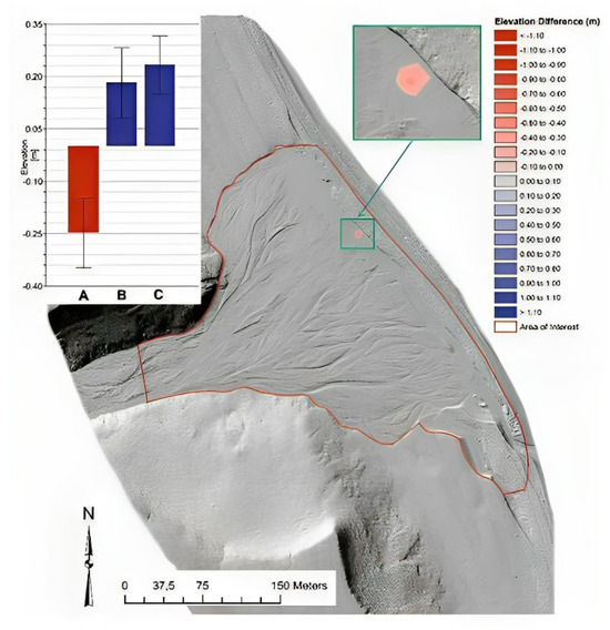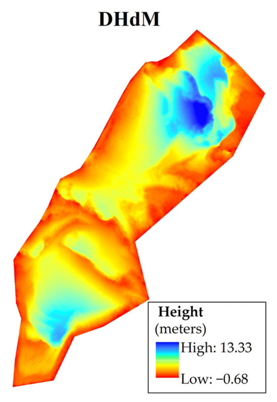 Figure 11. The DHdM, which represents the difference in height, is computed by subtracting the drone-acquired DEM-DRONE from the restored DEM [44].