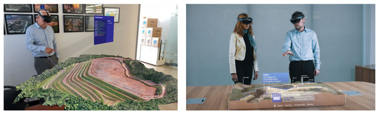 Edelbro, et al. [95] conducted 20 qualitative interviews with rock mechanics engineers and other professionals in related roles across different industries and roles. Their research revealed that there are notable benefits to utilising AR technology. The most important advantage identified by the authors for the future use of AR technology would be the ability to visualise data gathered from field investigations and to perform real-time analyses, such as wedge and stress analysis, to create solutions tailored to the specific needs of rock reinforcements. For training and education in virtual reality, UNSW’s School of Minerals and Energy Resources Engineering in Sydney created a longwall mine and a transport roadway [96]. In a project aimed at the environmental reclamation of an Alberta oil sands mine site, the BGC Engineering company attempted to develop MR models for communication purposes (Figure 13). Their objective was to assist clients in improving shareholder value, obtaining the social license for a project, and lowering project expenses. This project started in 2017, and the present status is unknown [97].