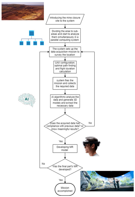 This study aimed to explore the feasibility of incorporating UAV–AI–MR as an all-encompassing system for effectively managing a mine closure project. The components of the proposed technology were thoroughly examined, and their respective applications in mine closure, as well as their benefits, drawbacks, and gaps, were discussed in detail. It was determined that UAV might be a more effective data collection method than traditional approaches. However, their limited battery life and payload capacity could hinder projects with large areas of interest. These technical issues can be addressed using AI sub-programs within the comprehensive system, which can identify the most efficient data collection routes, calculate flight times, and ensure the return to base for recharging before continuing the mission. Furthermore, certain sensors, such as LiDAR, have yet to be tested in a closure project on a UAV, and should be explored in future research. The utilisation of algorithms and AI techniques has seen a broad range of applications in recent years, including 3D modelling, ground surface change tracking, and vegetation indicators. However, there has been a lack of research focused on AI methods that can automatically detect and control changes in surface components. Additionally, the computational time required by recently developed algorithms has not been adequately discussed, despite its importance in developing comprehensive tools for the future. Furthermore, real-time compliance checker tools have not been developed, and the benefits of high-performance computing (HPC) and cloud computing in developing a comprehensive system have not been investigated in the literature. To create a comprehensive system, a multitude of AI-based sub-systems need to be developed and integrated into a system that can work simultaneously using HPC and cloud computing techniques. Integrating AI methods with MR engines can create a fully autonomous UAV–AI–MR program.