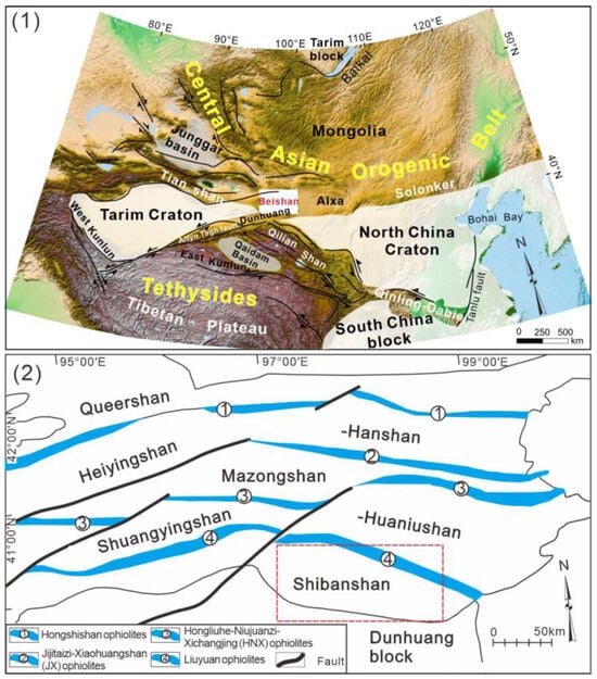 (1) Simplified tectonic map showing the CAOB, Tethysides, and Tarim and North China Cratons (modified after [1]); (2) Tectonic map of the Beishan orogen (modified after [8]).