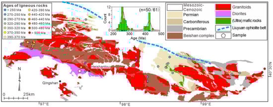 - Yang, Z.X.; Zhao, Q.H.; Zhang, J.; Chen, S.M.; Zhang, L.T.; Li, S.Y.; Jin, D.L.; Gong, Z.Z.; Zhao, J.C. Chronological and Geochemical Characteristics of the Heishantou Quartz-monzodiorite in the Beishan Area, Gansu Province, China, and Their Geological Significances. Acta Metall. Sin. 2022, 41, 1165–1177, (In Chinese with English abstract). [Google Scholar] [CrossRef]