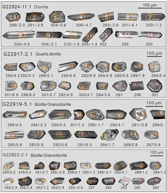 Cathodoluminescence (CL) images of the analyzed zircons. The red and yellow circles on zircons show the positions for U-Pb dating and Lu-Hf isotope analysis, respectively. The numbers below zircons represent 206Pb/238U ages and ℇHf(t) values, respectively.