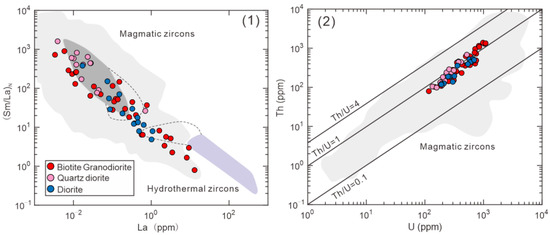 (1) (Sm/La)N vs. La and (2) Th vs. U diagrams for the analyzed zircons. The notation “N” indicates chondrite-normalized values. The magmatic and hydrothermal zircon fields (dark gray and purple shaded areas, respectively) with extensions (dashed line) illustrated in (1) are from [55]. The broader magmatic zircon fields (light gray shaded area) in (1,2) are from [58].