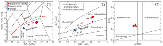 (1) Total alkali (Na2O + K2O) vs. SiO2 diagram [59]; (2) K2O vs. SiO2 diagram [60]; (3) A/NK vs. A/CNK diagram [61]. A/NK = (mol) Al2O3/(Na2O + K2O) and A/CNK = (mol) Al2O3/(Na2O + K2O + CaO).