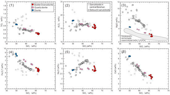 Diagrams of various major elements vs. SiO2 contents. (1) TiO2 vs. SiO2; (2) Al2O3 vs. SiO2; (3) MgO vs. SiO2; (4) Fe2O3T vs. SiO2; (5) Na2O vs. SiO2; (6) CaO vs. SiO2. The Setouchi sanukitoid data are from [62,63,64]. The central Beishan sanukitoid data are from [13,65]. The data for metabasaltic and eclogite experimental melts (1–4.0 GPa) are from [66,67,68,69,70].