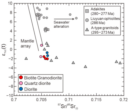 ℇNd(t) vs. 87Sr/86Sr diagram. Data for the adakites (280–277 Ma) are from [16]. The data for Liuyuan ophiolites (286 Ma) are from [17]. Data for A-type granitoids (295–273 Ma) are from [19,72].