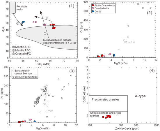 (1) Mg# vs. SiO2 diagram. Mg# = 100*Mg2+/(Mg2+ + Fe2+). Data for metabasaltic and eclogite experimental melts (1–4.0 GPa) are from the same source as those in Figure 8(2). Arrows 1 and 3 are after [79]; arrow 2 is after [68]. (2) Cr vs. MgO diagram. (3) Ni vs. MgO diagram. Data for the Setouchi and central Beishan sanukitoids are from the same source as those in Figure 8. (4) 10,000×Ga/Al vs. Zr + Nb + Ce + Y diagram [80].