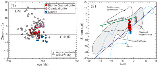 (1) Zircon ℇHf(t) vs. age (Ma) diagram. Data for A-type granitoids (295–273 Ma) are from the same source as those in Figure 10. (2) Zircon ℇHf(t) vs. the whole-rock ℇNd(t) diagram. The fields of oceanic sediments, including deep-sea clays and biogenic muds, Fe-Mn crusts and nodules, and sands, the seawater array, and the terrestrial array are from [81,82].