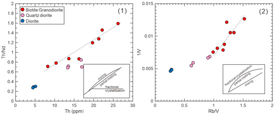 (1) Th/Nd vs. Th and (2) 1/V vs. Rb/V diagrams [88].