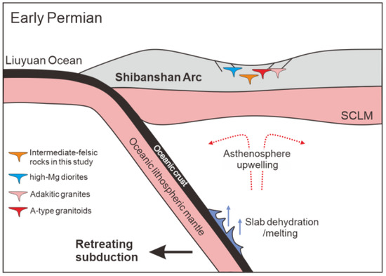 Furthermore, our study reveals the involvement of different magma components in the formation of early Permian intermediate–felsic rocks, indicating the interaction between crustal- and mantle-derived magma. Early-mid Permian (295–273 Ma) granitoids with A-type affinities were documented in the Shibanshan unit [19,72]. The occurrence of A-type granitoids most likely indicates an extensional setting, where crustal source rocks experienced partial melting under relatively high temperatures and low pressures [94,104]. These A-type granitoids show many variable whole-rock Sr-Nd and zircon Hf isotope compositions (Figure 10 and Figure 12), suggesting strong interaction between the depleted mantle and/or juvenile lower crust and ancient crustal rocks. Here, we propose a retreating subduction zone developed in the Shibanshan unit during the early Permian period (Figure 15). Retreating subduction occurs where the rate of rollback of the subducted slab is greater than the rate of advance of the overriding plate, leading to crustal extension in the latter [105]. The extensional regime within the overriding continental arc likely facilitated the generation of A-type granitoids in the Shibanshan unit (Figure 15) [106]. Additionally, during retreating subduction, the upwelling hot asthenospheric mantle can cause the partial melting of overriding crustal rocks, in which mantle materials can be involved, producing the strong crust–mantle interaction discussed above. In summary, it is inferred that the retreating subduction of the Liuyuan Ocean produced the early Permian intermediate–felsic magmatism in the Shibanshan unit (Figure 15).