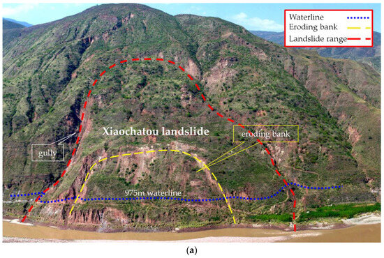 (a) The Xiaochatou landslide exhibits a distinctive landscape characterized by significant geological deformations and topographical alterations. (b) The study region, encompassing the Xiaochatou landslide, is located in a specific geographic location. It is typically described in terms of its geographical coordinates or by referencing nearby landmarks or boundaries. The location may be indicated using latitude and longitude coordinates or by specifying the region’s relation to cities or geographical features.