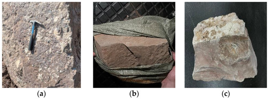 The gypsum in the red-bed rock mass of the reservoir area dissolves in groundwater and is collected in rock cracks and bedding by the water flow, as shown in Figure 3a. As the solution concentration increases, the gypsum precipitates in crystal form once it reaches dissolution equilibrium. The precipitated gypsum adheres to the rock mass surface or fills cracks between the original rock mass due to losing the gypsum mineral component in the original rock mass. This process destroys the structure of the red-bed rock mass, forming some dissolution holes, as shown in Figure 3b. This increases the porosity and enhances the permeability. The description of red-bed rock samples is shown in Table 1.