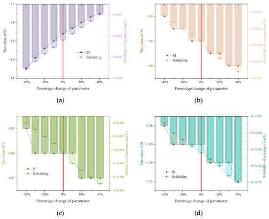Then, a sensitivity analysis was performed [38,39,40,41]. In this paper, the sensitivity function was used to evaluate gypsum dissolution. The sensitivity function can be available in closed form or given only as a numerical procedure to compute y given by x. Typically, the output y is a scalar variable that “summarizes” the wide range of variables (often time series, possibly spatially distributed) provided by the simulation. The sensitivity function of each parameter can be obtained from Figure 9 by the least square method. To rank the influence of each parameter, the sensitivity indices that the sensitivity function can define are often employed in a sensitivity analysis and important measures. These synthetic indices quantify the relative contribution to output uncertainty from each input. A sensitivity index of zero means that the associated information is non-influential, while the higher the index, the more influential the intake. In this case, the slope of the linear fitting of each parameter and the range of change were considered for such a sensitivity index. The sensitivity ranking of each parameter is given in Table 5. The sensitivity ranking from large to minor is SO42−, pH, Ca2+, Mg2+, HCO3−, and Na+.