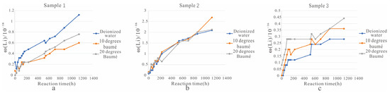 (3) Using 20 degrees baumé (Figure 3c), the ore dissolution effect, from good to bad, was as follows: sample 2, 1, and 3. However, before 54 h, the ore dissolution effect of sample 3 was generally better than that of sample 1. When the experiment was conducted for 630 h, the dissolved Li+ concentration in sample 2 under 20 degrees baumé reached saturation (Table 3).