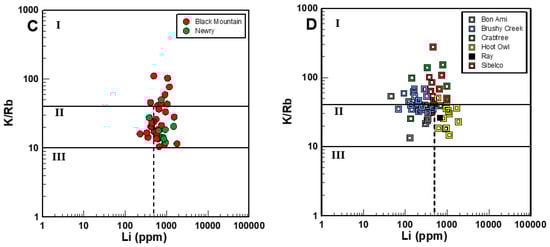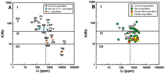 The K/Rb versus Li plot, first utilized by Černý and Burt [9], was extensively used by pegmatite researchers to evaluate the geochemical evolution and degree of fractionation of individual pegmatite bodies and pegmatite groups. This diagram highlights variations in Li content and K/Rb ratios of muscovite from different pegmatite types and illustrates the continuity in fractionation of Li and Rb from muscovite to lithian muscovite to lepidolite in pegmatites of different types. However, meaningful interpretation of the plot is hindered by the limited data available at the time of the Černý and Burt [9] study. The plot does not establish clear boundaries that differentiate between muscovite, lithian muscovite, and lepidolite, common to complex pegmatite types, or pegmatites with different styles of Li-mineralization.