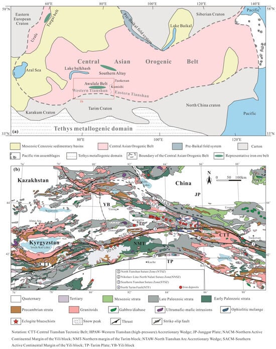 - Feng, J.X.; Shi, F.P.; Wang, B.Y.; Hu, J.M.; Wang, J.T.; Tian, J.Q. Volcanogenic Iron Deposits in the Awulale Metallogenic Belt in Western Tianshan; Geological Publishing Hous: Beijing, China, 2010; pp. 16–112. (In Chinese) [Google Scholar]