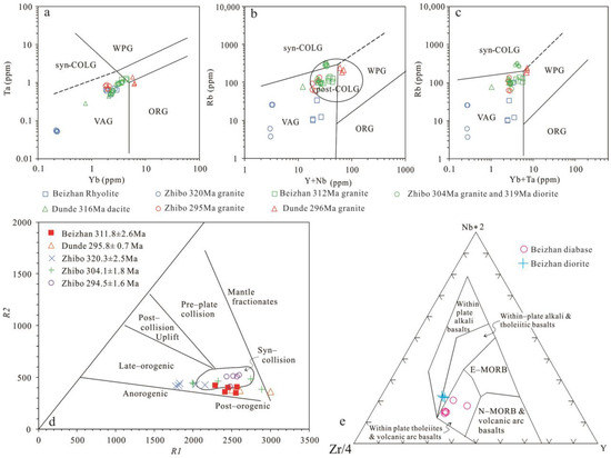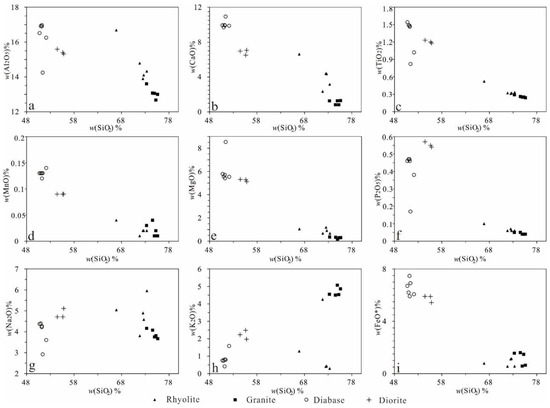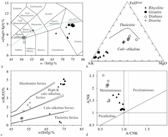 - Pearce, J.A.; Harris, N.B.W.; Tindle, A.G. Trace element discrimination diagrams for the tectonic interpretation of granitic rocks. J. Petrol. 1984, 25, 956–983. [Google Scholar] [CrossRef]