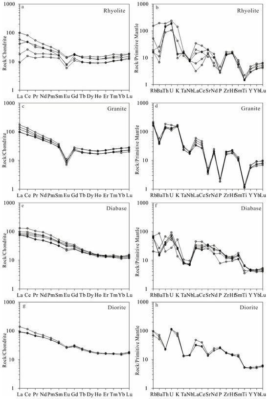 - Alteration occurrence: The alteration of chlorite and carbonate is common in diabase dyke, but very few are found in its wall-rock rhyolite, suggesting that diabase is rich in water.