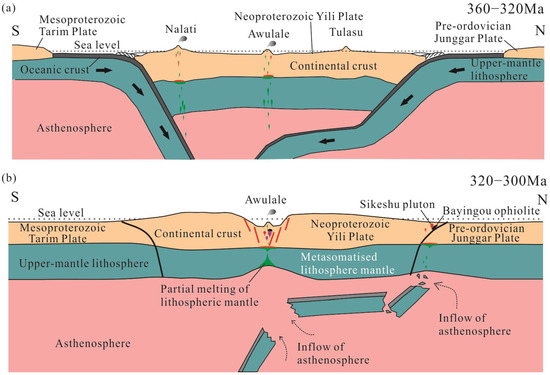 - Feng, W.Y.; Zhu, Y.F. Petrogenesis and tectonic implications of the late Carboniferous calc-alkaline and shoshonitic magmatic rocks in the Awulale mountain, western Tianshan. Gondwana Res. 2019, 76, 44–61. [Google Scholar] [CrossRef]