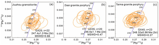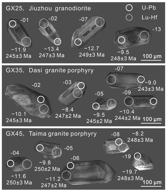 One sample from each of the studied granitic bodies was selected for zircon U–Pb dating (Table S1). The results of the analyses were all concordant or nearly concordant (Figure 4), yielding weighted mean 206Pb/208U ages of 247.4 ± 1.0 Ma (2σ; MSWD = 0.66; n = 22) for Jiuzhou granodiorite, 246.6 ± 1.1 Ma (2σ; MSWD = 0.47; n = 20) for Dasi granite porphyry, and 248.32 ± 0.98 Ma (2σ; MSWD = 0.27; n = 23) for Taima granite porphyry, being identical within error with each other. Moreover, one zircon grain from the Jiuzhou granodiorite exhibits an older 206Pb/208U age of 357 ± 5 Ma, as is also the case for three zircons (694 ± 4 Ma, 536 ± 10 Ma, 451 ± 11 Ma, respectively) from the Dasi granite porphyry, implying these are inherited zircons.