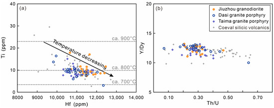 (a) Ti vs. Hf and (b) Y/Dy vs. Th/U variations in zircons from granitic rocks of the Qinzhou Bay Granitic Complex. Previously published data for the coeval silicic volcanic rocks are from [21].