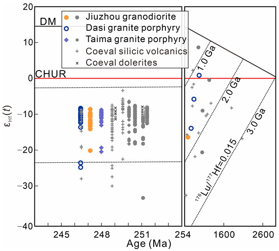 The εHf(t) values of the analyzed zircons span a wide range from −23.9 to −7.8 (Figure 6; Table S3). Although each sample has one or two zircons reflecting a highly enriched Hf isotopic composition (εHf(t) < −18.5), most of the zircons show unimodal distributions ranging within 5–6 units. Excluding several outliers, the weighted mean εHf(t) values are −10.5 ± 0.6, −9.8 ± 0.6, and −9.8 ± 0.5, corresponding to two-stage model ages (TDM2) of 1.76–2.10 Ga, 1.74–2.07 Ga, and 1.77–2.03 Ga for the Jiuzhou granodiorite and Dasi and Taima granite porphyries, respectively. As for the highly enriched members, the two-stage model ages range from 2.20 to 2.75 Ga.