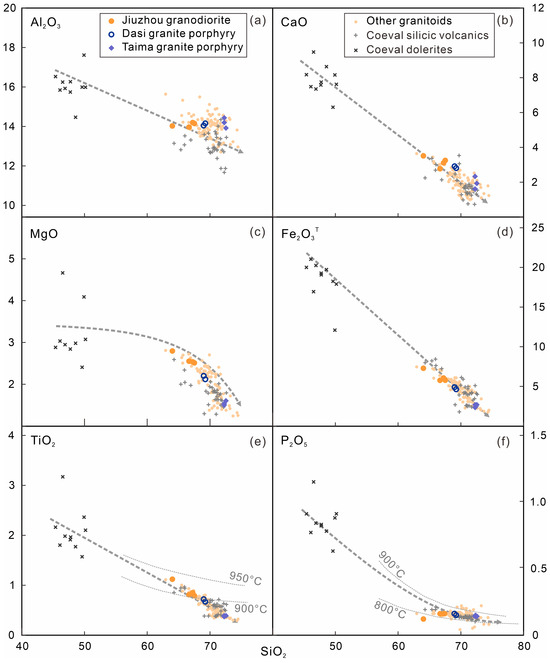 Combined with the coeval silicic volcanic rocks and granitoids reported in the literature, our data show the content of SiO2 correlated negatively with Fe2O3T, Al2O3, MgO, CaO, TiO2, P2O5, and MnO (Figure 9) and positively with K2O and Na2O + K2O (Figure 7a,c). Several processes could potentially account for the modification of granitic magma compositions, including fractional crystallization and cumulate formation, the entrainment of restitic material, and/or magma mixing with mantle-derived melts. Above, we have argued fractional crystallization might have played a less important role during the magmatic evolution, because of the narrow geochemical variation within a single granitoid body and the lack of a fractional signature in the cogenetic silicic volcanic rocks. Although restitic material was notably found within the Jiuzhou granodiorites, occurring both in centimeter-size enclaves and micro-restite [16], the whole-rock geochemical trends could not be explained by restite entrainment as plagioclases in the restite were insufficient in content to replicate the observed compositional variations [58].