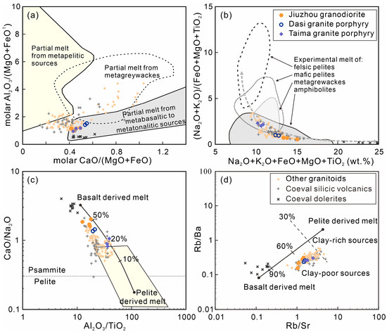 The granitoids in the Qinzhou Bay area, together with the cogenetic volcanic rocks, exhibited lower molar Al2O3/(MgO + FeOT), (Na2O + K2O)/(FeO + MgO + TiO2), Al2O3/TiO2, Rb/Sr, and Rb/Ba ratios but a higher CaO/Na2O ratio compared to the typical metapelite-derived melt (Figure 10), which was discussed above as the major magma source. Thus, these compositional distinctions suggested magmas of such compositions could not solely originate from metapelitic sources. Instead, an evident transitional trend between metapelite- and basalt-derived melts reveals the input of mantle-derived materials or juvenile crust cannot be precluded in the genesis of the granitoids.