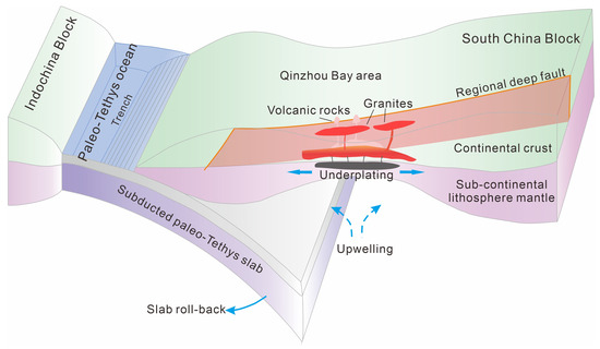 Schematic geodynamical model of Early Triassic tectono-magmatism in the Qinzhou Bay area, South China (modified after [68]). A sequence of Permian–Triassic arc igneous rocks, along with high-pressure, low-temperature metamorphic rocks, and notably ophiolites, are observed across the Ailaoshan-Song Ma suture zone, stretching towards Hainan Island [55,68] (and references therein). It is also essential to highlight the higher temperatures necessary for the formation of the Qinzhou Bay Granitic Complex compared to those of the coeval I- and S-type granites in the interior South China Block. Our preference leans toward the model that asserts the Late Permian–Triassic tectono-magmatism in the South China Block was influenced by paleo-Tethys subduction.