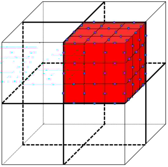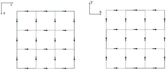 Here, ν represents the weight function. When using the spectral element method for solving, the weight function is chosen as the three-dimensional vector high-order spectral element basis function formed via Gauss–Lobatto–Legendre (GLL) polynomials. Similar to the FEM, the scalar SEM cannot satisfy the physical boundary conditions of vector electromagnetic fields, leading to spurious solutions in the computed results. On the other hand, the vector SEM can automatically satisfy the internal boundary conditions of the governing equations. Therefore, this paper adopts the vector spectral element method to solve the transient electromagnetic forward problem. The placement of degrees of freedom within the interior plane of the element is shown in the figure (Figure 2).