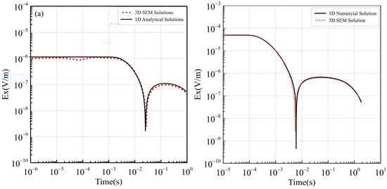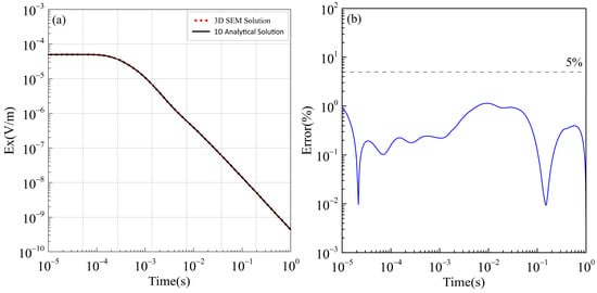 Validation of transient electromagnetic spectral element method in a three-layered medium: (a) Comparison of the electric field response between spectral element method and one-dimensional analytical solution; (b) Relative error plot.