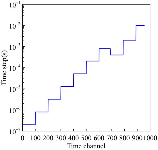 To ensure the accuracy of the algorithm, this study utilized the proposed method to calculate the electric field response in a layered medium and compared it with the one-dimensional analytical solution with the same parameters (Figure 4a). The stratigraphic parameters are set as follows: the thicknesses are 500 m, 100 m, and infinite, and the resistivities are 100 Ω·m, 20 Ω·m, and 100 Ω·m, respectively. Figure 4b shows the relative error between the two methods. In terms of algorithm parameters, the spectral element method was set to order 3, resulting in a total of 6480 elements, 184,525 nodes, and 543,840 degrees of freedom after mesh refinement, the time steps are shown in Figure 5. Each time step calculation requires two calls to the Pardiso solver to solve a linear system of equations. In the initial call, assigning the right-hand side takes about 15 s, followed by an LU decomposition step that takes around 11 s. Then, a back substitution step takes about 0.15 s. Subsequently, only back substitution is performed until a change in the time step occurs, at which point the right-hand side changes, and the above operations need to be repeated. From the figure, it can be observed that the relative error between the two methods is below 5%, meeting the required accuracy and demonstrating the practical feasibility of the algorithm. Additionally, this study considered a homogeneous half-space model with a source length of 1000 m, offset distance of 5000 m, subsurface resistivity of 1000 Ω·m, polarization rate of 0.1, and time constant of 1. A three-layer dielectric model with a low-resistivity polarization layer in the intermediate layer, as shown in Table 1, was also investigated (Figure 6). The electric field responses were obtained using both the spectral element method and the one-dimensional numerical simulation (Figure 7a,b). From Figure 7, it can be observed that under the same observation parameters, the electric field response obtained using the proposed algorithm exhibits a high degree of agreement with the corresponding one-dimensional numerical simulation curve [47].