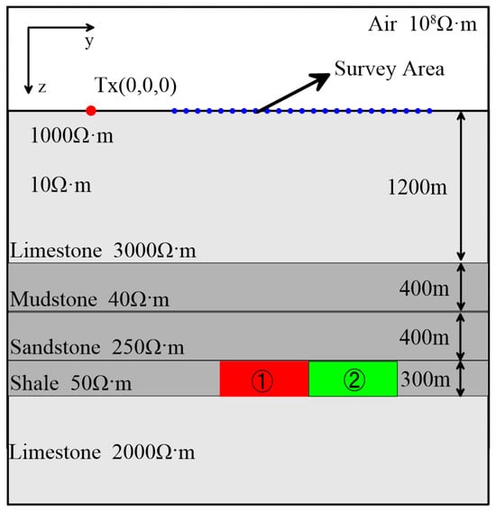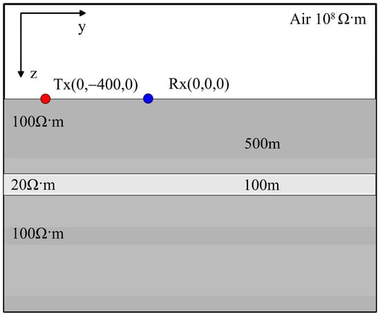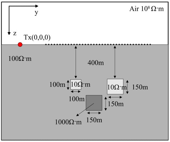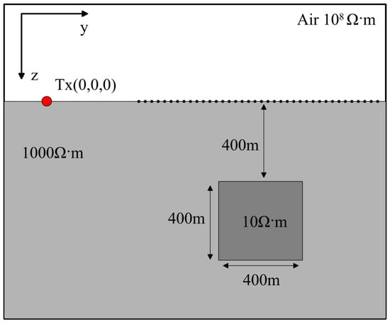 In addition, this study designed underground models of a low-resistivity anomaly and multiple anomalies to investigate the electric field response characteristics of polarized underground bodies. Figure 10 shows the model of the low-resistivity anomaly, with a 600 m long wire source as the transmitter, a current intensity of 100 A, a measurement grid of 600 m × 800 m, a spacing of 50 m between measurement points, a total of 221 measurement points, and an anomaly size of 200 m × 400 m × 400 m. The resistivity of the anomaly is 10 Ω·m, the polarizability is 0.5, the time constant is 1 s, and it is buried at a depth of 400 m. The resistivity of the surrounding rock is 1000 Ω·m.