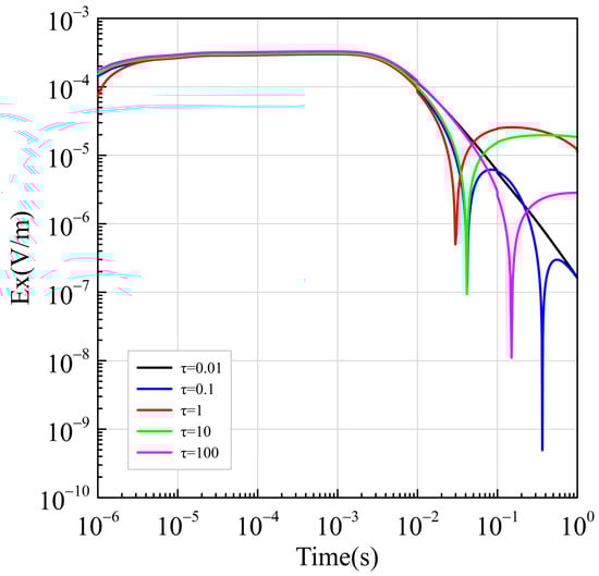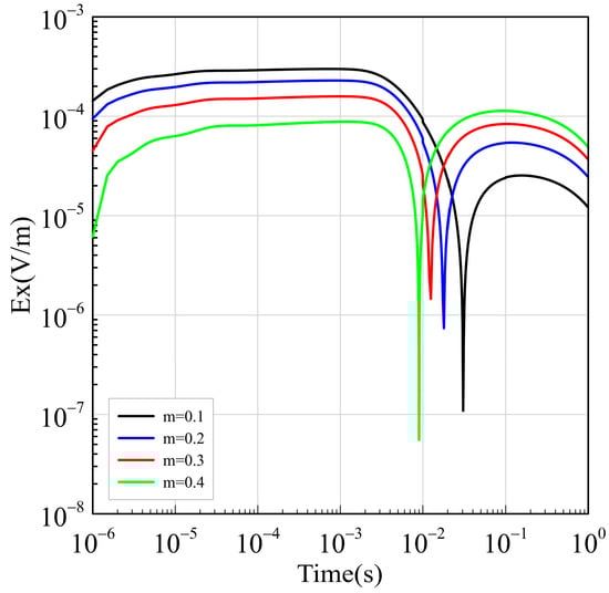 To investigate the influence of different IP parameters of subsurface media on the electric field response curves for the accurate inversion of subsurface structures and rock properties, a homogeneous polarizable half-space model with a resistivity of 1000 Ω·m is set up. The polarization factor, denoted as “m”, is controlled at 0.1. The variable time constant τ is changed to 0.01 ms, 0.1 ms, 1 ms, 10 ms, and 100 ms, respectively. The electric field responses are calculated and plotted for comparison to observe the effect of different time constants on the electric field response. From Figure 8, it can be observed that when the time constant is less than 1 s, the smaller the value of τ, the later the negative response of the electric field appears and the smaller its amplitude. When the time constant is greater than 1 s, the smaller the value of τ, the earlier the negative response of the electric field appears and the larger its amplitude. Furthermore, with the time constant τ set to 0.1 s, the polarization factor “m” is changed to 0.1, 0.2, 0.3, and 0.4, respectively. The corresponding electric field responses are calculated and plotted for comparison to observe the effect of different polarization factors on the electric field response. Figure 9 shows that as the polarization factor increases, the negative response of the electric field appears earlier and with a larger amplitude.