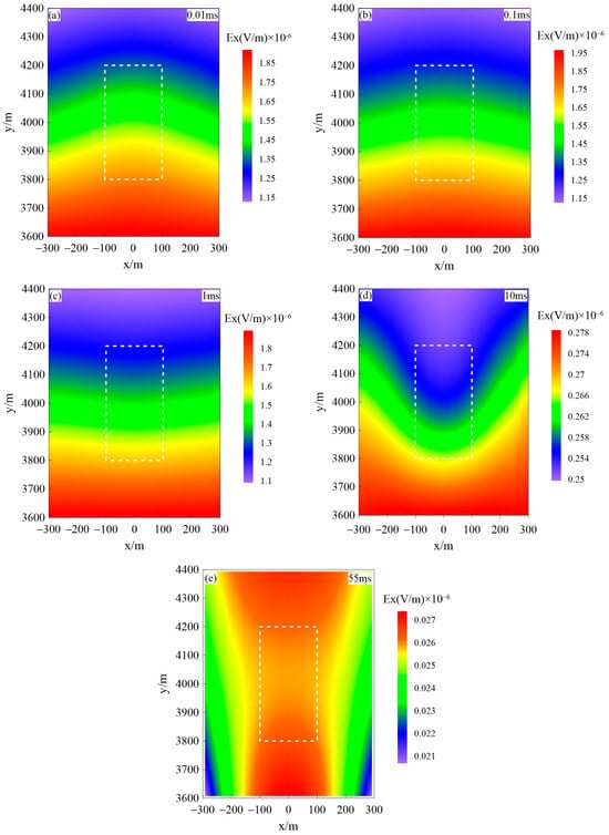 Electric field response at different time gates in the xy plane for a low-resistivity polarized anomaly (The white dashed box indicates the location of the anomaly): (a) 0.01 ms, (b) 0.1 ms, (c) 1 ms, (d) 10 ms, and (e) 55 ms.