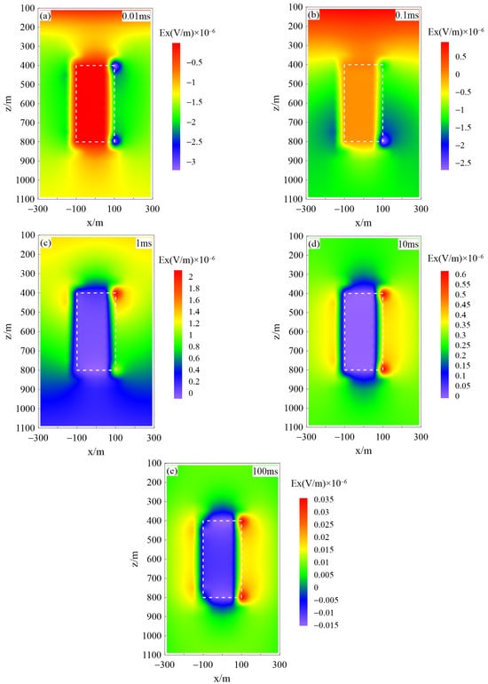 Figure 11 illustrates the electric field responses of a polarized anomaly with low resistivity at various time channels in the xy plane. Figure 11a–e correspond to the responses at time channels of 0.01 ms, 0.1 ms, 1 ms, 10 ms, and 55 ms, respectively. The white dashed line represents the position of the anomaly. The electric field response values gradually decay over time. In the early stage, the electric field response to the anomaly decays faster compared to the surrounding rock, while in the later stage, the decay is slower, and the response values are higher than the surrounding rock. By analyzing the decay of the electric field response over time, we can make an approximate inference about the distribution of the anomaly body in the xy plane.