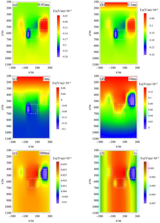 Electric field response at different channels in the xz plane for multiple polarized anomaly bodies (The white dashed box indicates the location of the anomaly): (a) 0.01 ms, (b) 0.1 ms, (c) 1 ms, (d) 10 ms, (e) 100 ms, and (f) 1 s.