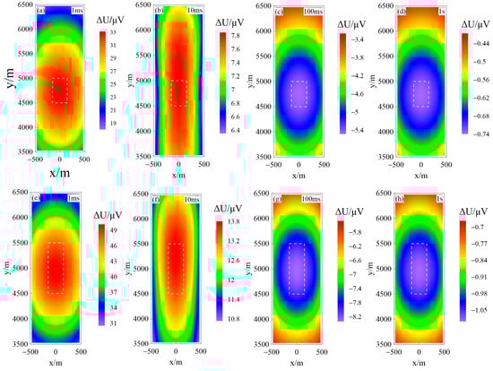 Forward modeling is a numerical simulation method that simulates the physical phenomena of subsurface media to match the observed results. Its main purpose is to integrate with the actual geological conditions. To simulate the feasibility of the transient electromagnetic considering the IP effect based on SEM in hydraulic fracturing monitoring, this study refers to the well data of Well Jiaoye 30 in the Fuling Shale Gas Field area and designs a physical model of two-stage fracturing (Figure 15). The length of the source is 3000 m, the thickness of the fracturing layer is 300 m, and the fracturing area extends along the y direction by 500 m after each fracturing stage. The resistivity before fracturing is 50 Ω·m, and the IP parameters are all set to 0. After fracturing, the resistivity decreases due to the injection of fracturing fluid, assuming the resistivity decreases to 5 Ω·m, with a polarizability of 0.5 and a time constant of 1. Figure 16a–d show the contour maps of the voltage difference at 1 ms, 10 ms, 100 ms, and 1 s time channels before and after the first-stage fracturing, while Figure 16e–h show the contour maps of the voltage difference at 1 ms, 10 ms, 100 ms, and 1 s time channels before and after the second-stage fracturing. From the figures, it can be observed that the fracturing range in the xy plane at each time channel varies due to the attenuation of the electromagnetic signal over time. The reverse voltage appears after 100 ms, and the fracturing area is displayed most accurately. In addition, it can be observed that the overall voltage difference values after the second-stage fracturing are higher than those after the first-stage fracturing in the same time channel. The stronger the signal, the easier it is for the instrument to capture the electromagnetic response of multiple fracturing stages. These results indicate the promising application of the TEM time domain spectral element method considering the IP effect in shale gas fracturing detection.