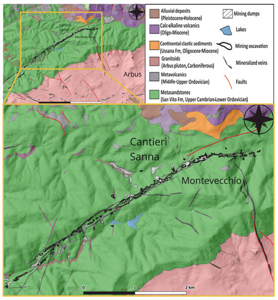 - Cuccuru, S.; Naitza, S.; Secchi, F.; Puccini, A.; Casini, L.; Pavanetto, P.; Linnemann, U.; Hofmann, M.; Oggiano, G. Structural and metallogenic map of late Variscan Arbus Pluton (SW Sardinia, Italy). J. Maps 2016, 12, 860–865. [Google Scholar] [CrossRef]