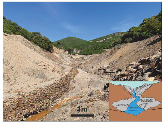 - De Giudici, G.; Medas, D.; Cidu, R.; Lattanzi, P.; Rigonat, N.; Frau, I.; Podda, F.; Marras, P.A.; Dore, E.; Frau, F.; et al. Assessment of origin and fate of contaminants along mining-affected Rio Montevecchio (SW Sardinia, Italy): A hydrologic-tracer and environmental mineralogy study. Appl. Geochem. 2019, 109, 104420. [Google Scholar] [CrossRef]