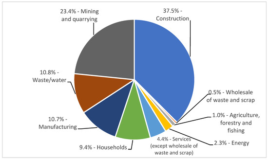 Figure 1 demonstrates the main wastes generated in the EU according to economic activities and households. In the EU, construction contributed 37.5% (% share of total waste) of the total in 2020. It was followed by mining and quarrying (23.4%), waste and water services (10.8%), manufacturing (10.7%), and households (9.4%); the remaining 8.2% was waste generated from other economic activities, mainly services (4.4%) and energy (2.3%) [8].