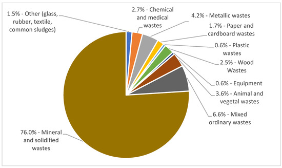 One way to improve the quality of the CDW is the classification and concentration by type of material, which can be carried out by different types of equipment that use density as a separation factor, such as water- or air-based processes. Several authors have studied cases of CDW recycling plants [12,13,14,15]. As a form of initial classification, these plants usually crush the CDW and remove particulates such as plastics, paper, and wood as well as metal parts (ferrous and non-ferrous) by methods such as sieving, use of magnetic mats, or manual removal in the case of materials of larger sizes. The “inert CDW” material contains bricks, tiles, plaster, concrete, mortar, and coarse aggregate [11,16,17]. Figure 2 shows that around 76% of CDWs is composed of solidified and inert materials.