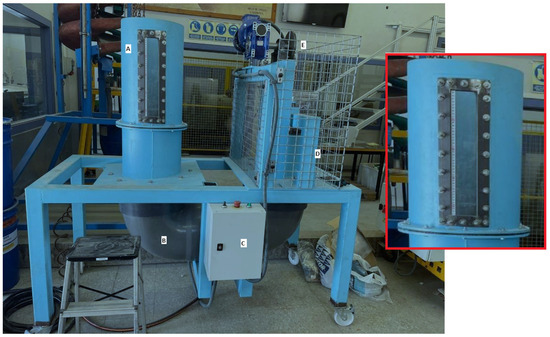 Image of the jig equipment used in the experiments: (A) jig chamber (enlarged), (B) water passage duct, (C) electric panel, (D) pump chamber, and (E) motor.