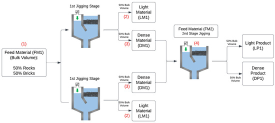 The flowchart of the two-stage jigging process made to concentrate the binary mixture of rocks and bricks.